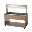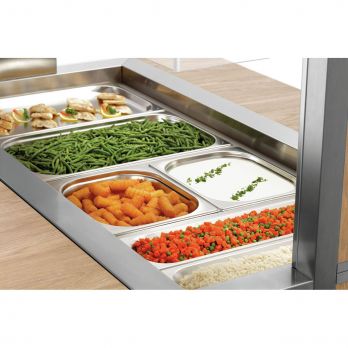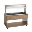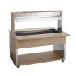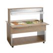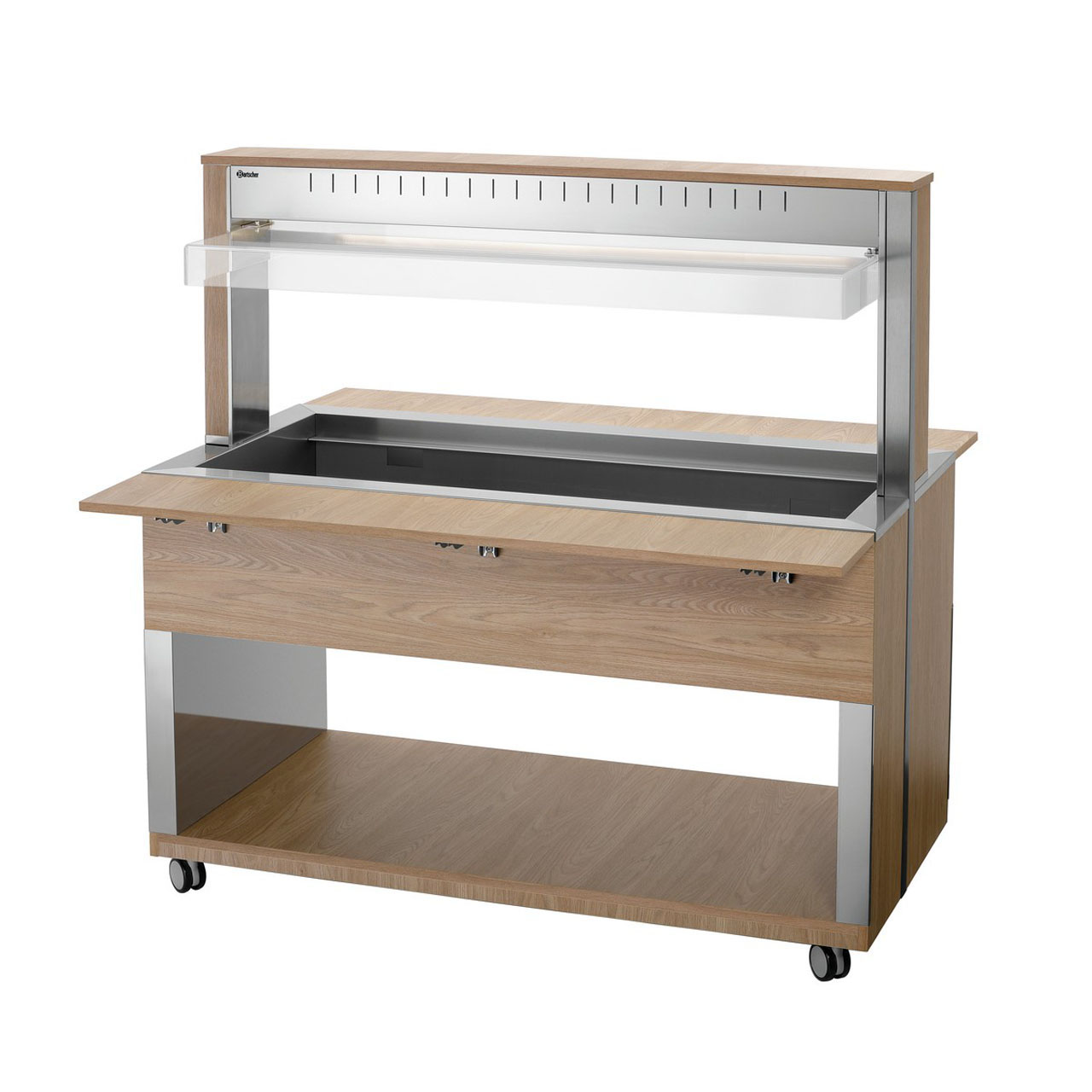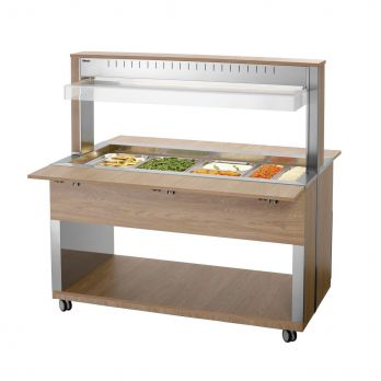 Bufetový vyhřívaný vozík pro 4x GN 1/1-200 mm (530 x 325 mm) s hygienickou ochranou a LED osvětlením (lze spínat samostatně). 6x otočná kolečka, 2 z toho uzamykatelná. Dodává se smontovaný. Součástí 4 příčky: D 528, Š 30 mm. Materiál laminované dřevo, nerez, plast. Barva jilmu. Parametry: - 1 vodní lázeň z nerezové oceli - výpustný kohout - pro 4x GN 1/1 (530x325 mm), max. do 200 mm (gastronádoby nejsou součástí dodávky) - teplotní rozsah 30 - 90 °C - sklápěcí police na tácy, rozměr: Š 1495 x H 250 mm - LED osvětlení, lze spínat samostatně - hygienická ochrana proti vnějším vlivům - kontrolka ZAP / VYP - spirálový propojovací kabel, délka 1,6 m - 6x otočná kolečka, 2 z toho uzamykatelná Příkon: 3016 kW / 230 V / 50 Hz Rozměr: Š 1495 x H 1250 x V 1510 mm Hmotnost: 133,5 kg