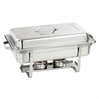 Chafing dish vyrobený z potravinářské nerezové chromniklové oceli. Vhodný pro GN 1/1 hloubky max. 100 mm. Součástí dodávky jedna gastronádoba a 2 nádobky na hořlavou pastu. Boční držák poklice. Obsah 14 litrů. Stohovatelný, materiál chromniklová ocel. Pro udržení teploty jídel. Rozměr: Š 605 x H 350 x V 305 mm, hmotnost 4,1 kg.