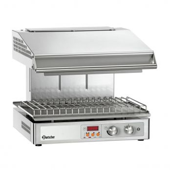 Bartscher - Elektrický salamandr se 3 topnými tělesy. Funkce udržování teploty, nerezová ocel, výškově nastavitelný topný prvek. Samostatně regulovatelné 2 topné zóny. Ruční nastavení času, digitální displej. Miska pro zachycení tuku a grilovací rošt (572 (Š) x 358 (H) mm). Včetně upevňovací konsoly. Příkon: 4,5 kW / 380-400 V. Rozměry: 580 (Š) x 590 (H) x 515 (V) mm. Hmotnost: 59,4 kg.