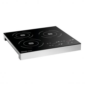 3 varné plochy - samostatně přepínatelné. Skleněná varná deska, plášť z odolného plastu. Dotykový ovládací panel s digitálním časovačem. Nastavení času: do 180 minut, s 1minutovým intervalem. Výkonové stupně: varná plocha: 1 – 1–10, 2 – 1–5, 3 – 1–10. 1 plotýnka vpravo: 1400 W, 10 úrovní výkonu. 2 plotýnky vlevo: celkem 2000 W. Přední plotýnka je k dispozici pouze do 2000 W při použití obou hořáků, je energie v závislosti na nastavení rozdělena, zadní plotýnky maximálně: 1000 W/5 úrovní výkonu. Teplotní rozsah: 60 °C do 240 °C, ve 20 °C intervalech. Příkon: 3,4 kW/220 - 240 V. Elektronická ochrana proti přehřátí. Rozměry: 510 (Š) x 485 (H) x 65 (V) mm. Hmotnost: 6,6 kg. Dětská pojistka, detekce nádobí. Z bezpečnostních důvodů dojde po určité době nečinnosti přístroje k jeho automatickému vypnutí.