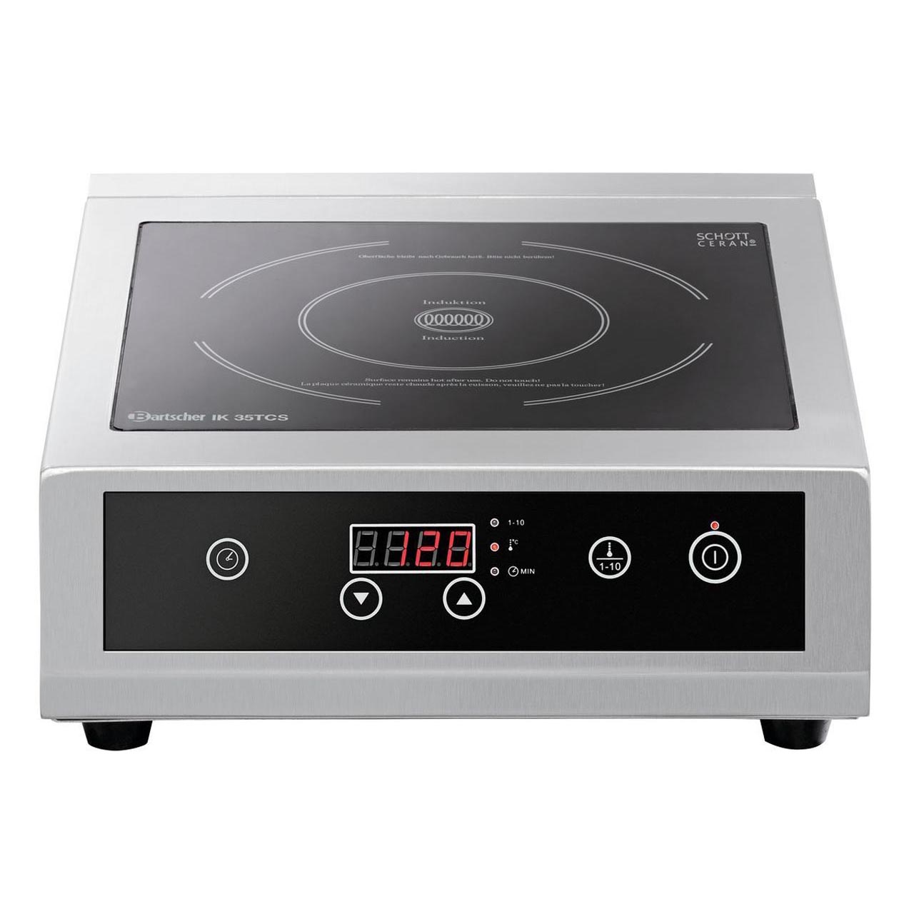 Skleněná varná plocha Schott Ceran, skříň vařiče z nerezové oceli. Dotykový ovládací panel s digitálním displejem. Časový spínač, 10 stupňů výkonu (max. 3500 W), 10 stupňové nastavení teploty (60 - 240 °C). Příkon: 3,5 kW/230 V. Elektronická ochrana proti přehřátí. Rozměry: 340 (Š) x 445 (H) x 117 (V) mm. Hmotnost: 7,5 kg. Z bezpečnostních důvodů dojde po určité době nečinnosti přístroje k jeho automatickému vypnutí.
