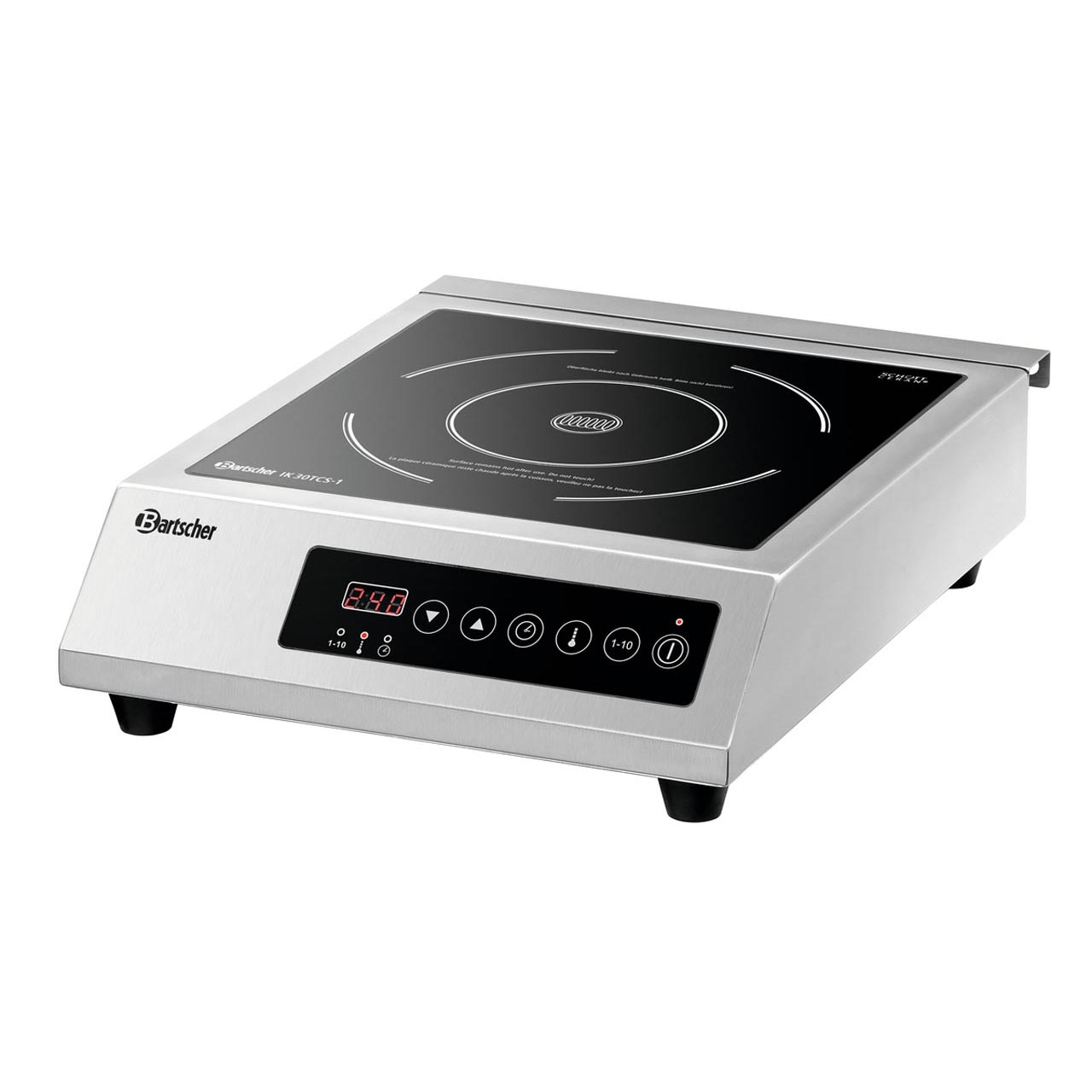 Stolní indukční vařič s dotykovým ovládacím panelem a varnou deskou SCHOTT CERAN® 3000 W. Skříň indukčního vařiče je z nerezové ušlechtilé oceli. Pro průměr hrnce 230 mm. Časovač do 180 minut, elektronická regulace, rozměr skleněné desky Š 275 x H 275 mm. Dotykový ovládací panel s digitálním displejem, 10 stupňů výkonu, 10 stupňů ohřevu od 60-240 °C. Ochrana proti přehřátí. Automatická detekce nádobí. Z bezpečnostních důvodů dojde po určité době nečinnosti přístroje k jeho automatickému vypnutí.