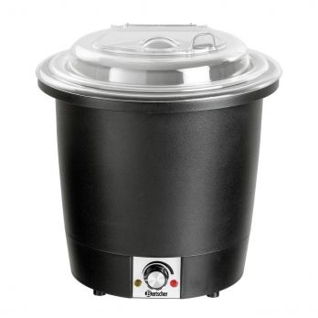 Díky průhlednému polykarbonátovému víku (s otvorem na naběračku) můžete kdykoli nahlédnout do hrnce. Udržujte teplotu polévek nebo omáček - bez zbytečné tepelné ztráty. Plášť z černého potravinářského plastu, vyjímatelná vložka z nerezové potravinářské oceli. Teplotní rozsah: 57 °C až 84 °C. Objem: 10,0 litrů. Příkon: 0,45 kW/230. Rozměry: pr. 330 mm, 380 (V) mm. Hmotnost: 3,0 kg.