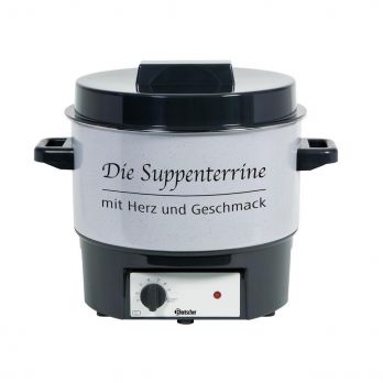Kotlík na polévku ze smaltované oceli; dno, víko a rukojeti jsou vyrobeny z vysoce kvalitního černého plastu. Přímý ohřev bez vody. Elektronické ovládání. Kontrolka zahřátí. Příkon: 1,8 kW/230 V. Objem: 16 lt. Rozměry: Š 465 x H 365 x V 370 mm. Hmotnost: 4,7 kg.