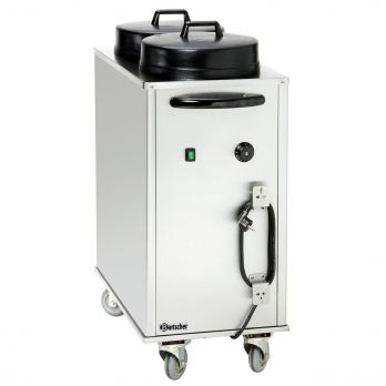 Pojízdný ohřívač talířů Bartscher. Z nerezové potravinářské oceli. Ovládání manuální/elektronické. Kontrolka ZAP/VYP. Termostatická regulace. S držadlem. Včetně dvou plastických vík. - teplotní rozsah: +30 až +110 °C; 2 teplotní lampy - kapacita: max. 2 x 50 talířů - max. o průměru 300 mm (max. 2 x 32 kg) - 4 kolečka z toho 2 brzděná; průměr koleček 100 mm - příkon: 2,0 kW / 230 V / 50 Hz - rozměry: Š 435 x H 820 x V 1025 mm - hmotnost: 54 kg Včetně 2 vík pro uchování teploty talířů.