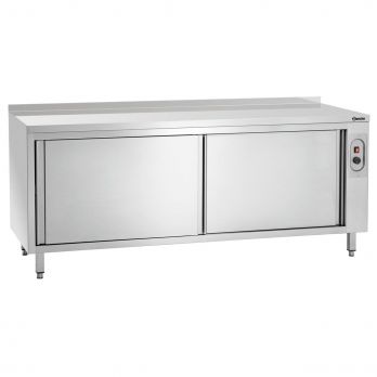 Ohřívací skříně s lemem 40 mm z nerezové oceli hloubky 700 mm různých šířek. Nastavitelné nohy, pracovní plocha ušlechtilá ocel. Rozsah teplot od 20 do 80 °C. Elektronická regulace, kontrolka, jednostranné posuvné dveře. Vnitřní prostor dělený na 2 části. 1 plná police není výškově nastavitelná. Nohy z čtvercové trubky 40 x 40 mm. Příkon 2 kW / 230 V / 50/60 Hz. Rozměry = Š x H x V v mm. Nosnost = max.nosnost pracovní desky / max. nosnost police.