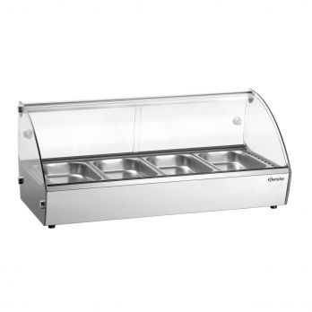 Vyhřívaná vitrína Bartscher R4 pro 4 gastronádoby GN 1/3 o hloubce max. 40 mm. Vitrína je vyrobena z nerezové oceli a bezpečnostního skla. Teplotní rozsah od 30 do 90 °C. Objem 46 litrů. Posuvná zadní otevírací dvířka, plynulá regulace teploty, zaoblené čelní sklo, ovládací otočný knoflík, kontrolka ON/OFF. Vytápění horkým vzduchem, zvlhčování pomocí odpařovací misky.