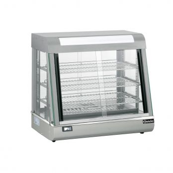 Posuvná dvířka zepředu i zezadu. Součástí vyhřívané vitríny jsou 3 nastavitelné poniklované rošty. Osvětlení a miska na vodu pro zvlhčování vzduchu. Termostatická regulace. Teplotní rozmezí: +30 °C až + 90°C. Provedení: nerez, uvnitř chromové, vně lakované, kolem dokola prosklená, bezpečnostní sklo.