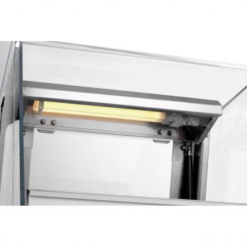 Vitrína pro gastronádobu 1x GN 1/1, max. hloubky 40 mm. Obsah 85 litrů. Gastronádoba není součástí dodávky. Rozměr mřížkového rámu Š 350 x H 325 mm, materiál nerezová ocel, není výškově nastavitelný. Zasklení jednoduché, celoobvodové, bezpečnostní sklo. Sklopné přední sklo a odnímatelná odkapávací miska usnadňují čištění. Zadní posuvné dveře. Teploměr. Typ vytápění suchý ohřev. Materiál vitríny nerezová ocel / sklo. Teplotní rozsah 30° - 110 °C. Ovládání knoflíkem, kontrolka topení, provozu. Regulace teploty termostatem. Vnitřní osvětlení halogenové. Příkon: 1,65 kW / 230 V / 50/60 Hz Rozměr: Š 505 x H 785 x V 560 mm. Hmotnost: 45 kg.
