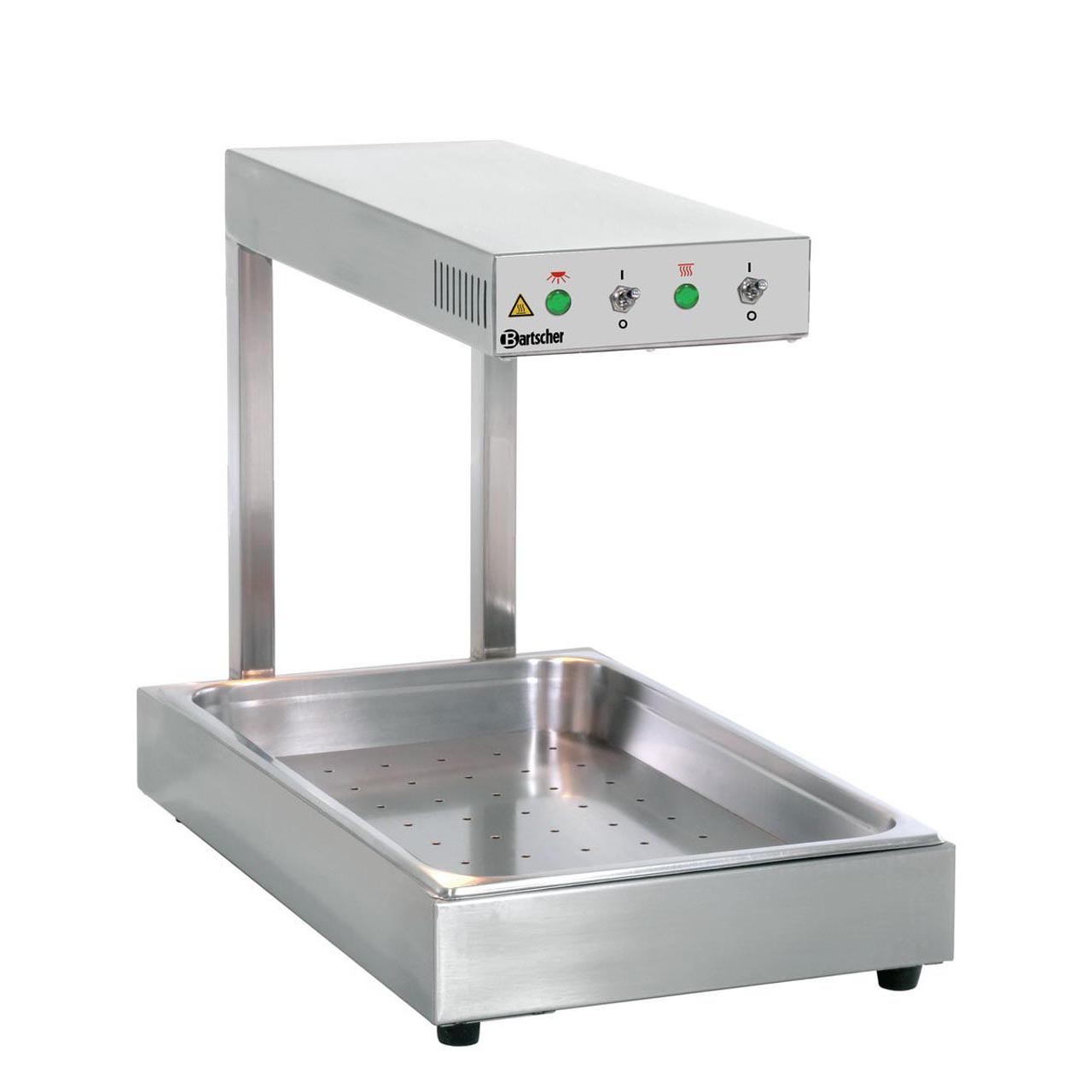 Ohřívač hranolků z chromniklové oceli. Součástí je gastronádoba GN 1/1-65 mm a děrovaný plech, který vložíte na dno gastronádoby. Pod plech stéká uvolněný tuk a jídlo tak nekoupete v olejové lázni. Ohřev s osvětlením a otvorem ventilace umístěn v horní části tepelného mostu. Oddělená kontrolka vrchního osvětlení a ohřevu; oddělený vypínač vrchního osvětlení a vypínač ohřevu. Rozměry: 335 (Š) x 570 (H) x 505 (V) mm. Příkon: 1,0 kW/230 V. Hmotnost: 8,3 kg.