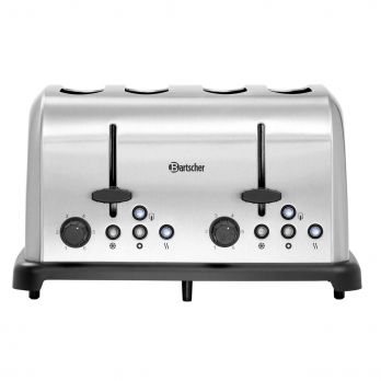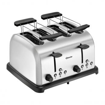 Toustovač TBRB40 Bartscher. Funkce rozmrazování, ohřívání a opékání toastů, sendvičových toastů a rohlíků, opékání bagel z jedné strany. 4 otvory, velikost 140 x 35 mm. 6 stupňů pro zhnědnutí toastů. Samostatné ovládání vždy dvou otvorů. 2x odnímatelný zásobník na drobky, tlačítko pro zastavení procesu, indikátor světla pro funkce. Součástí dodávky 2x nástavec. Materiál kartáčovaná ocel. Příkon: 1,48 kW / 230 V / 50/60 Hz. Rozměr: Š 325 x H 280 x V 170 mm. Hmotnost: 2,3 kg