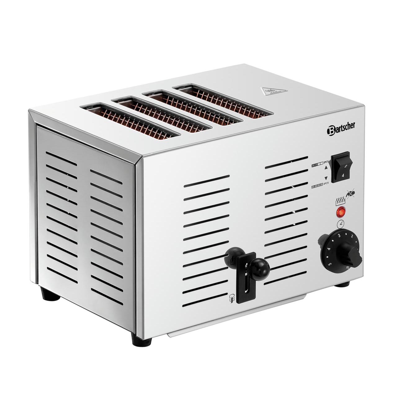 Toustovač volitelný na 2 nebo 4 plátky toastu. Plynule nastavitelný časovač. Materiál nerezová ocel. Rozměr otvoru: Š 145 x V 20 mm. Nastavení času opékání 1 až 5 minut, 1 manuální ovládání pro 4 otvory, kontrolka zahřátí. Odnímatelný zásobník na drobky, signalizace uplynutí času. Příkon: 1,8 kW / 230 V / 50 Hz. Rozměr: Š 300 x H 212 x V 220 mm. Hmotnost: 4,08 kg.