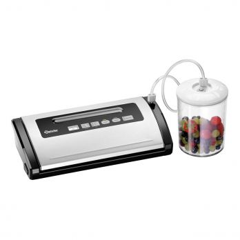 Materiál ušlechtilá ocel a odolný plast. Funkce: kombinované vakuování a zatavení, vakuování šetrné a normální, zatavení suché a mokré, marinování, vakuování pomocí nádoby (objednávejte samostatně). Vakuovací stroj s držákem fólie a integrovaným nožem. 1 svár, svařovací lišta délky 305 mm, 2 úrovně nastavení délky zatavení, vakuové čerpadlo 15 l/min (výkon pumpy: 0,9 m3/h, vakuum -800 mbar). Nastavitelná intenzita vysávání, regulace podtlaku. Včetně: 1x fóliová role Š 22 cm / D 3 m; 1x fóliová role Š 28 cm / D 3 m a 1x hadička pro odsátí vzduchu .
