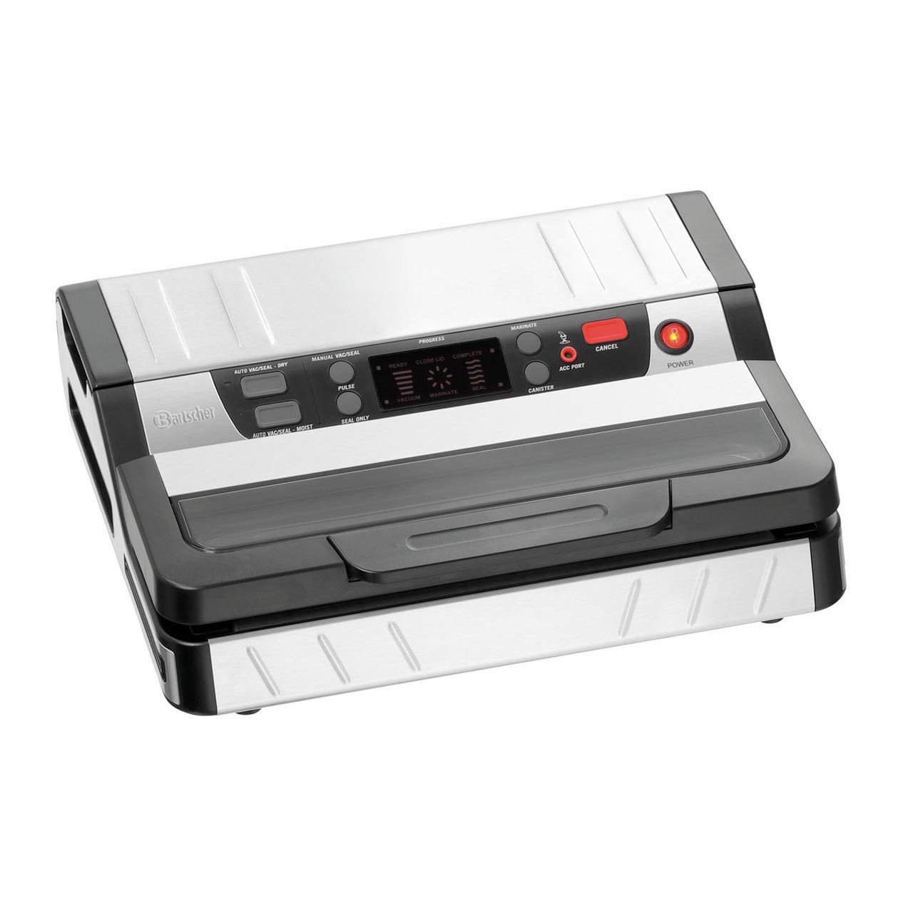 Vakuovací balička potravin pro všestranné využití. Ovládací tlačítko. Digitální displej. Osvětlení.Vypínač. Počet svarů 1 Délka svařovacího drátu 315 mm Vakuová pumpa 20 l/min. (cca 1,2 m3/hod.) Elektronické ovládání vakua Nastavitelná intenzita podtlaku. Součástí 1 role vakuové fólie (šířka 28 cm, délka 6 m) Maximální vakuum -980 mbar Funkce: Kombinované vysávání a těsnění, marinovaní, těsnění. Možné vysávání vakuovou nádobou (objednávejte zvlášť) Materiál: nerezová ocel, plast Pro vakuové těsnění používejte pouze embosované vakuové sáčky (na jedné straně s rýhováním) Příkon: 0,22 kW / 230 V / 50Hz Rozměr: Š 397 x H 345 x V 105 mm Hmotnost 4,854 kg