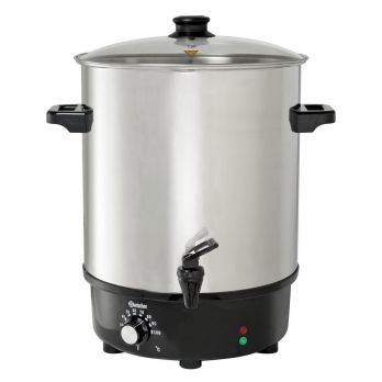 Zavařovací hrnec i hrnec na svařené víno Bartscher je vyrobený z kvalitní ušlechtilé nerezové oceli. Spodní podstavba, kohout a rukojeti jsou z kvalitní umělé hmoty. Víko skleněné s umělohmotnou rukojetí. Dodáváme včetně jednoho roštu o pr. 32 cm. Regulovatelný termostat od 30 °C do 100 °C. Příkon/napětí všech druhů: 2,0 kW/230 V. Vnější rozměry: 45 cm x 52 cm.