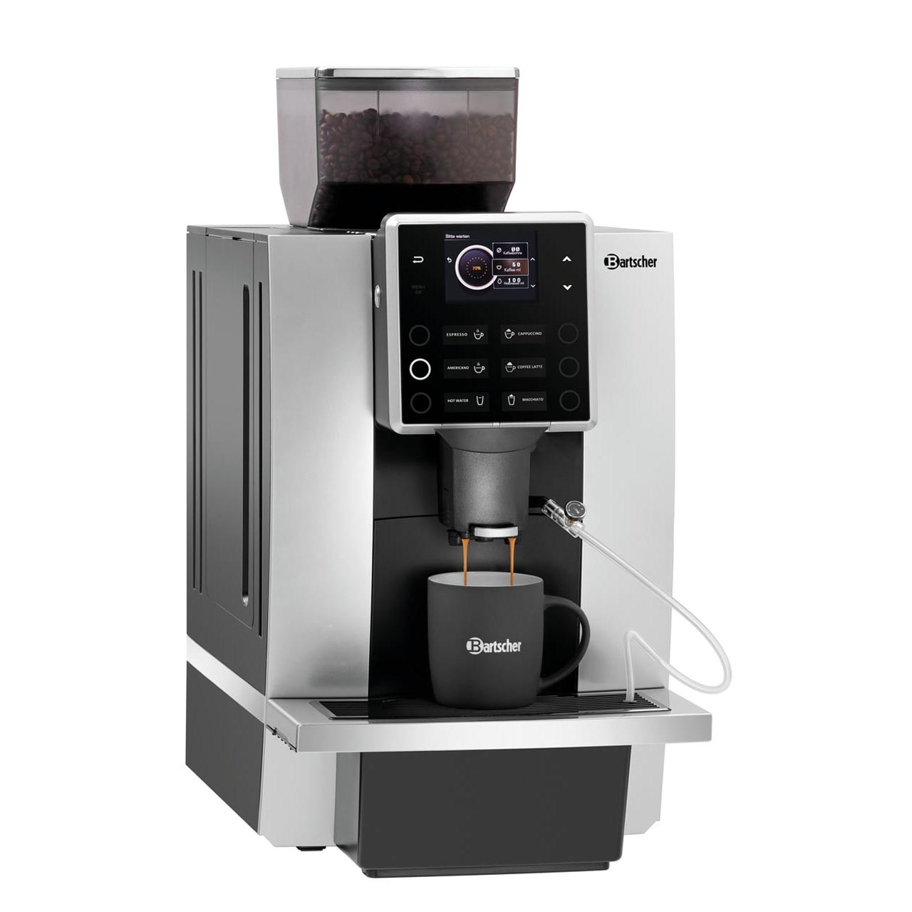 Plně automatický kávovar mluvící česky až na 6 druhů nápojů. Zásobník na vodu 1,8 litrů odnímatelný, zásobník na zrnkovou kávu 1000 g, zásobník kávové sedlina na cca 35 šálků. Elektronické ovládání, indikace odvápnění, indikace hladiny vody. Nastavitelná velikost šálku, porce mleté kávy, hrubost mletí 5 stupňů, teplota vody, 6 programů. Na displeji chybová hlášení, programy, aktuální průběh. Funkce: automatické vypnutí, 2 šálky, horká voda, výška výtoku od 100 do 160 mm, napěňovač mléka (přívod mléka hadičkou, regulace průtoku a teplotní regulace mléka), počítač šálků. Pevné připojení na vodu 1/2" nebo odnímatelný zásobník. Kávovar z odolného plastu, kuželový mlýnek z oceli. Tlakový systém pístový, tlak čerpadla 19 bar. Výrobní kapacita 80 šálků/den, maximální výkon 40 šálků á 120 ml/hodinu. Příkon: 2,7 kW / 230 V / 50/60 Hz Rozměr: Š 305 x H 330 x V 580 mm Hmotnost: 17,4 kg