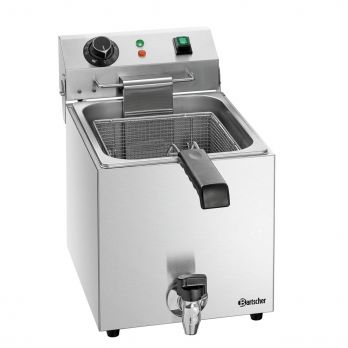 Fritéza 9 l s vypouštěcím kohoutem. Materiál nerezová ocel. Otočný topný článek pro rychlé čištění z nerezové oceli. Objem vany: 9 litrů (Š 240 x H 300 x V 200 mm),nastavení teploty od 50 °C do 190 °C, manuální řízení, kontrolka zahřání, ZAP/VYP. Bezpečnostní termostat, studená zóna. Součástí 1 koš (Š 210 x H 220 x V 120 mm, objem 5,5 l) a 1 víko. Příkon: 3,3 kW / 230 V /50 Hz. Rozměr: Š 300 x H 530 x V 385 mm. Hmotnost: 6,2 kg.