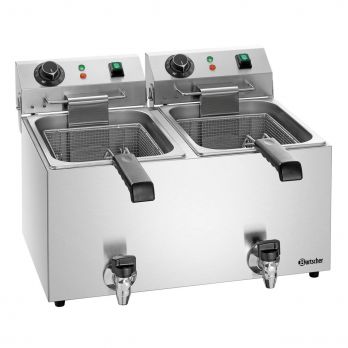 Fritéza 2x9 l s vypouštěcím kohoutem. Materiál nerezová ocel. Otočný topný článek pro rychlé čištění z nerezové oceli. Objem vany: 2x9 litrů (Š 240 x H 300 x V 200 mm),nastavení teploty od 50 °C do 190 °C, manuální řízení, kontrolka zahřání, ZAP/VYP. Bezpečnostní termostat, studená zóna. Součástí 2x koš (Š 210 x H 220 x V 120 mm, objem 5,5 l) a 2x víko. Příkon: 2x3,3 kW / 230 V /50 Hz. Rozměr: Š 575 x H 530 x V 385 mm. Hmotnost: 11,5 kg.