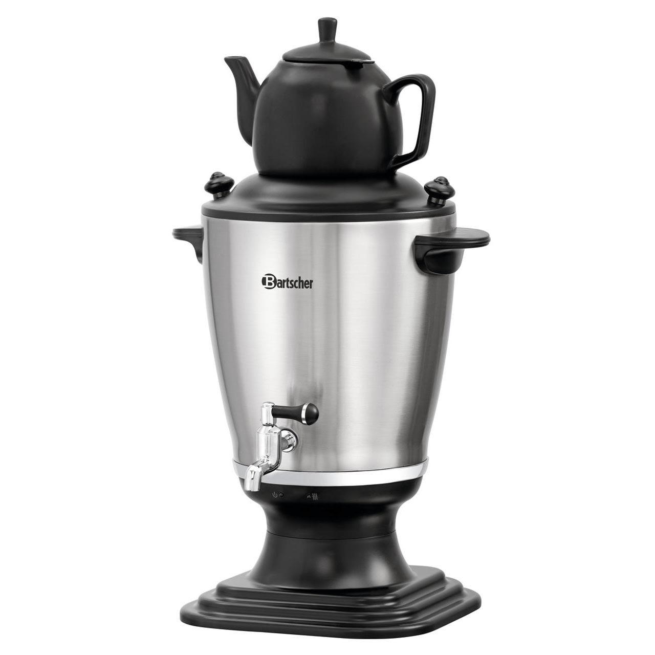 Požitek z čaje na ruský a orientální způsob. Z nerezové potravinářské oceli. Objem: 3,2 litrů, pr. 200 mm. Tepelně izolované rukojeti. Ochrana proti přehřátí. Automatické vypnutí. Funkce udržování teploty, nelze regulovat. Příkon: 2 kW/230 V. Rozměry: 270 (Š) x 275 (H) x 495 (V) mm (včetně konvice). Příslušenství zahrnuje: kameninovou konvici 0,8 litrů a sítko na čaj. Hmotnost: 2,15 kg.