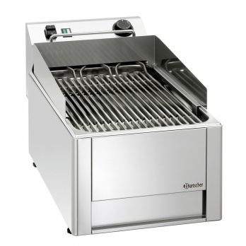 Elektrický vodní gril s manuálním ovládáním, kontrolka ohřátí. Grilovací rošt Š 280 x H 445 mm, 3 stupňová regulace. Zahřátí cca 2,5 min na nejvyšší stupeň. Nádoba na vodu GN 1/1. Dodáváno včetně čisticí škrabky. Vodní gril je vyroben z chromniklové oceli. Rozměr: Š 330 x H 630 x V 330 mm. Příkon: 4,08 kW / 400 V, 3 NAC. Hmotnost: 13,5 kg.