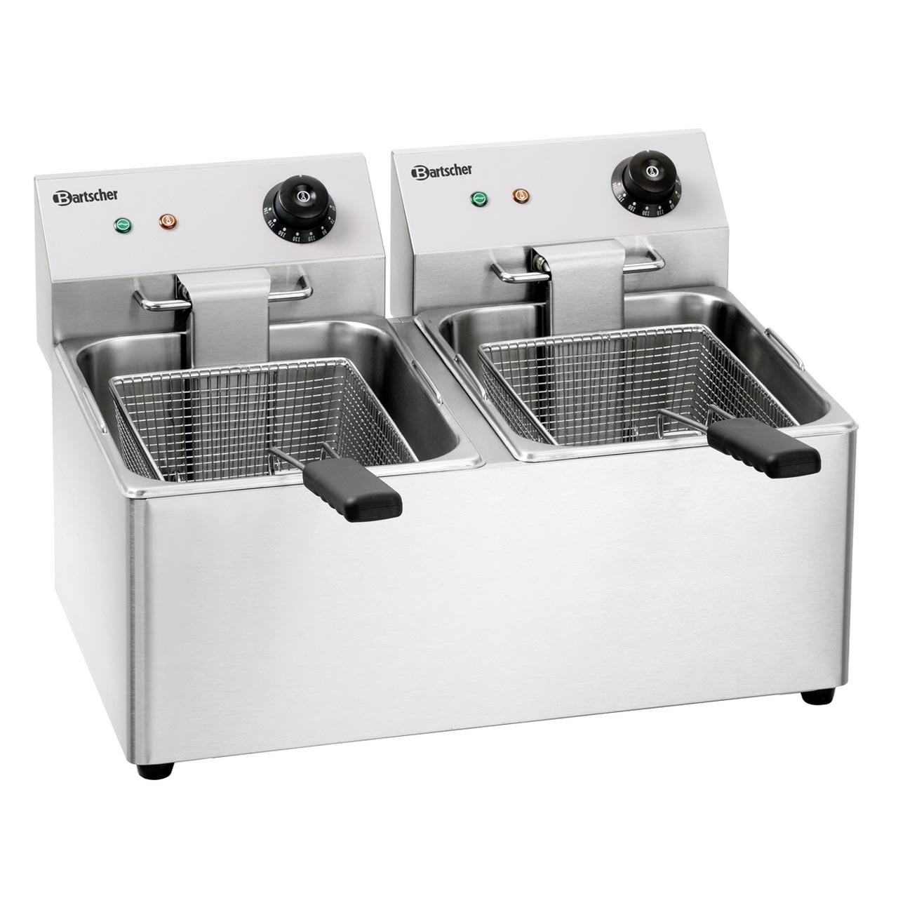 Dvojitá elektrická fritéza je vyrobena z nerezové potravinářské oceli. Ve výrobku je zabudovaný bezpečnostní termostat (ochrana proti přehřátí). Studená zóna. Nutné 2 oddělené zásuvky. Objem: 2 x 8 litrů. Příkon: 2 x 3,25 kW/2 x 1N AC 230 V. Rozměry: 555 (Š) x 620 (H) x 340 (V) mm. Hmotnost: 12,5 kg. Příslušenství zahrnuje: 2 vany, 2 koše.
