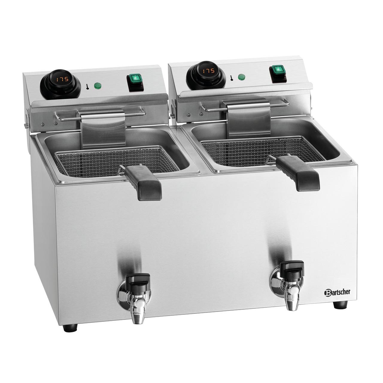 Stolní elektrická fritéza určená pro rychlá občerstvení a menší gastro provozy. Topné těleso z nerezové oceli lze vyklopit. Připojení zařízení 2 x 1 NAC. Požadovány dvě oddělené zásuvky. 2 x koš: Š 210 x H 220 x V 120 mm; obsah 5,5 litrů 2 x vana, Š 240 x H 300 x V 200 mm; obsah 9 litrů Studená zóna, bezpečnostní termostat, kohout na vypouštění tuku, digitální displej, teplotní rozsah od 50 až 190 °C, regulace teploty elektronické , v krocích po 1 °C. Kontrola teploty oleje - aktuální teplotu lze kdykoli vyvolat, kontrolka dosažené teploty oleje. Manuální ovládání, digitální knoflík MDI, vypínač ON/OFF. Světelné značení: zahřátí, zap/vyp, připraveno k provozu, dosažená teplota. Materiál nerezová ocel. Vhodné pro smažení oleje a tuku (blokový tuk. Včetně 2 košů a 2 vík. Příkon: 6,6 kW / 230 V. Rozměr: Š 561 x H 485 x V 385 mm. Hmotnost 11,7 kg.