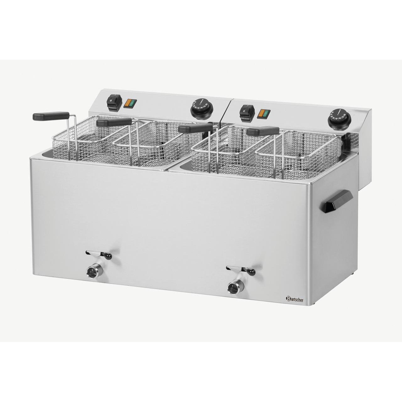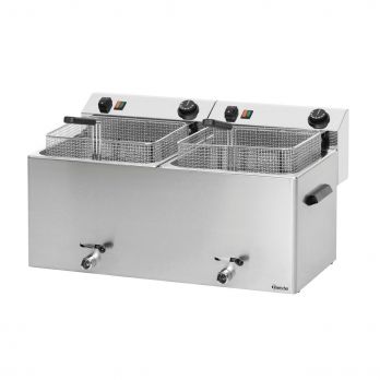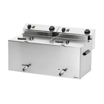 Skříň, víko a spínací skříňka fritézy z nerezové potravinářské oceli. Ve výrobku je zabudovaný bezpečnostní termostat (ochrana proti přehřátí). Studená zóna. Nutné 2 oddělené zásuvky. Objem: 2 x 10 litrů. Příkon: 16,2 kW/1N AC 400 V. Rozměry: 750 (Š) x 450 (H) x 375 (V) mm. Hmotnost: 22,0 kg. Příslušenství zahrnuje: 2 vany, 2 koše (1 koš: 300 (Š) x 240 (H) x 120 (V) mm).