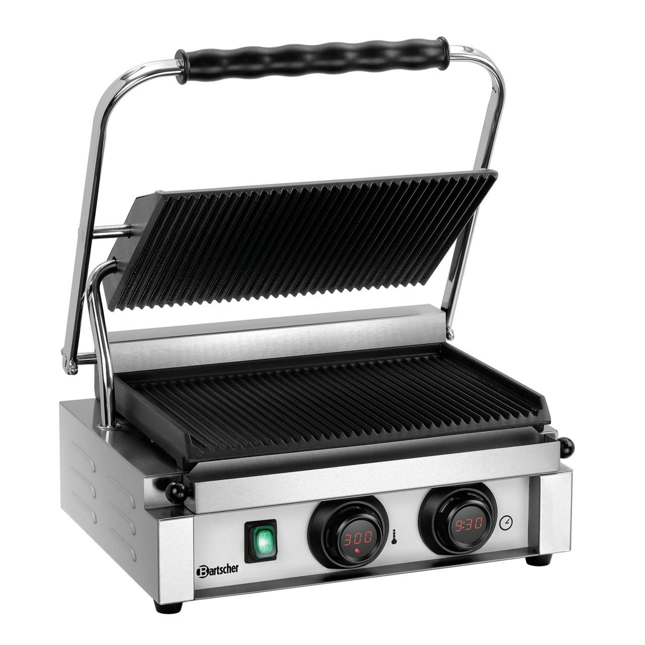 Kontaktní gril s vroubkovanými grilovacími deskami, s digitálním displejem, časovačem a signalizací. Materiál ušlechtilá ocel, smaltované litinové desky. Včetně čistícího kartáče. Elektronická regulace teploty, rozsah od 50 do 300 °C. manuální řízení. Signalizace po uplynutí nastavené doby, kontrolka ohřevu; kontrolka zapnuto/vypnuto. Odkapávací miska pro zachycení tuku. Příkon: 2,2 kW / 230 V. Rozměr: 410 (Š) x 400 (H) x 200 (V) mm. Rozměry horní grilovací desky: 340 (Š) x 220 (H) mm, rozměry dolní grilovací desky: 360 (Š) x 285 (H) mm. Hmotnost: 18,3 kg.