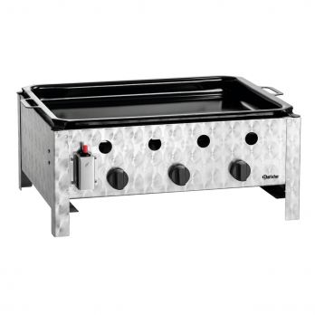 Stolní plynový gril s ocelovou pánví potaženou smaltem. Pánev Š 705 x H 540 x B 43 mm. Na plyn propan-butan, piezo zapalování, Přípojka 1/4", tlak 50 mbar. Celkem 3 hořáky. Dodáváno včetně 3 sad plynových trysek 0,8 mm (30 mbar, 37 mbar, 50 mbar). Vyrobeno z ušlechtilé oceli. Rozměr: Š 705 x H 560 x V 275 mm. Hmotnost 13,9 kg. Příkon 10 kW.
