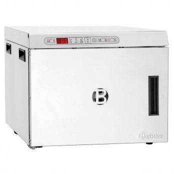 Nízkoteplotní trouba typu holdomat včetně vpichovací sondy. Zařízení z nerezové potravinářské oceli. Varný prostor má zaoblené rohy a odnímatelné vodící lišty pro snadné čištění. Funkce nízkoteplotního vaření do 110°C a HOLD pro udržování teploty potravin. Kapacita 3 x GN 1/1 nebo 3 plechy 600 x 400 mm (hloubka 65 mm). Sonda pro měření teploty jádra potravin. Rozsah teplot: 30 - 110°C. Digitální ovládací panel. Vzdálenost mezi lištami 80 mm. Dveře s magnetickým zavíráním. Příkon 1,2 kW / 230 V. Rozměry: 505 (Š) x 715 (H) x 415 (V) mm. Hmotnost 27 kg.