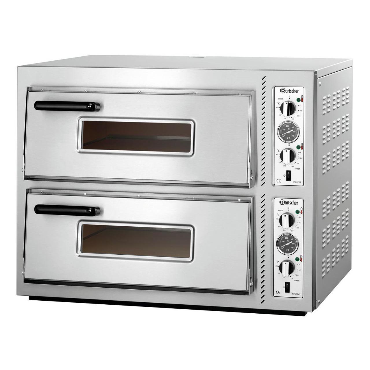 Pizza pec Bartscher. Určeno pro 2x 4 pizzy o průměru 30 cm. Dvě pečící komory 620 x 620 x 140 mm, okénko. Vyrobeno z lakovaného ocelového plechu. Termostatická analogická regulace teploty, nastavení teploty od 85 °C do 400 °C. Nezávislé ovládání horního a dolního topného tělesa. Izolace rockwool (kamenná vlna). Vnitřní osvětlení. Komora plně z odolného žáruvzdorného šamotu. Rozměr celkem: 930 (Š) x 835 (H) x 730 (V) mm. Příkon 10 kW / 400 V. Hmotnost 151,6 kg.