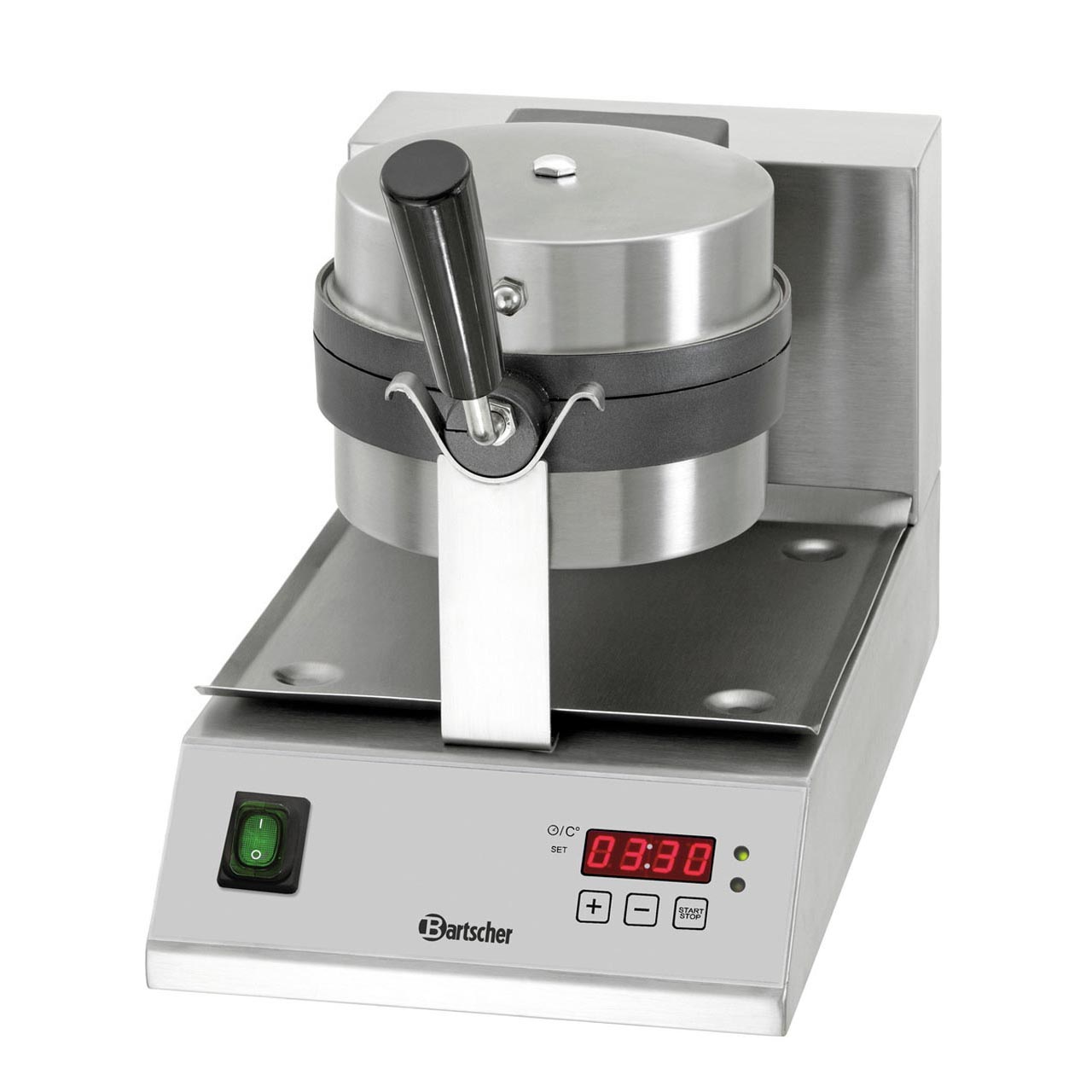 Vaflovač s pečícími deskami ve tvaru talíře (možnost otáčení vlevo i vpravo o 180 °C - zaručené optimální pečení). Pečící desky jsou přidělané na pevno. Nerezové provedení, pečící desky z litiny. Digitální displej pro programování a skladování pečených vaflí. Velikost desky: pr. 170 mm, 35 (V) mm. . Regulace teploty: 125 - 230 °C. Příkon: 1,0 kW/230 V. Rozměry: 250 (Š) x 495 (H) x 385 (V) mm. Včetně odkapávací misky (250 (Š) x 280 (H) mm). Hmotnost: 10,5 kg.