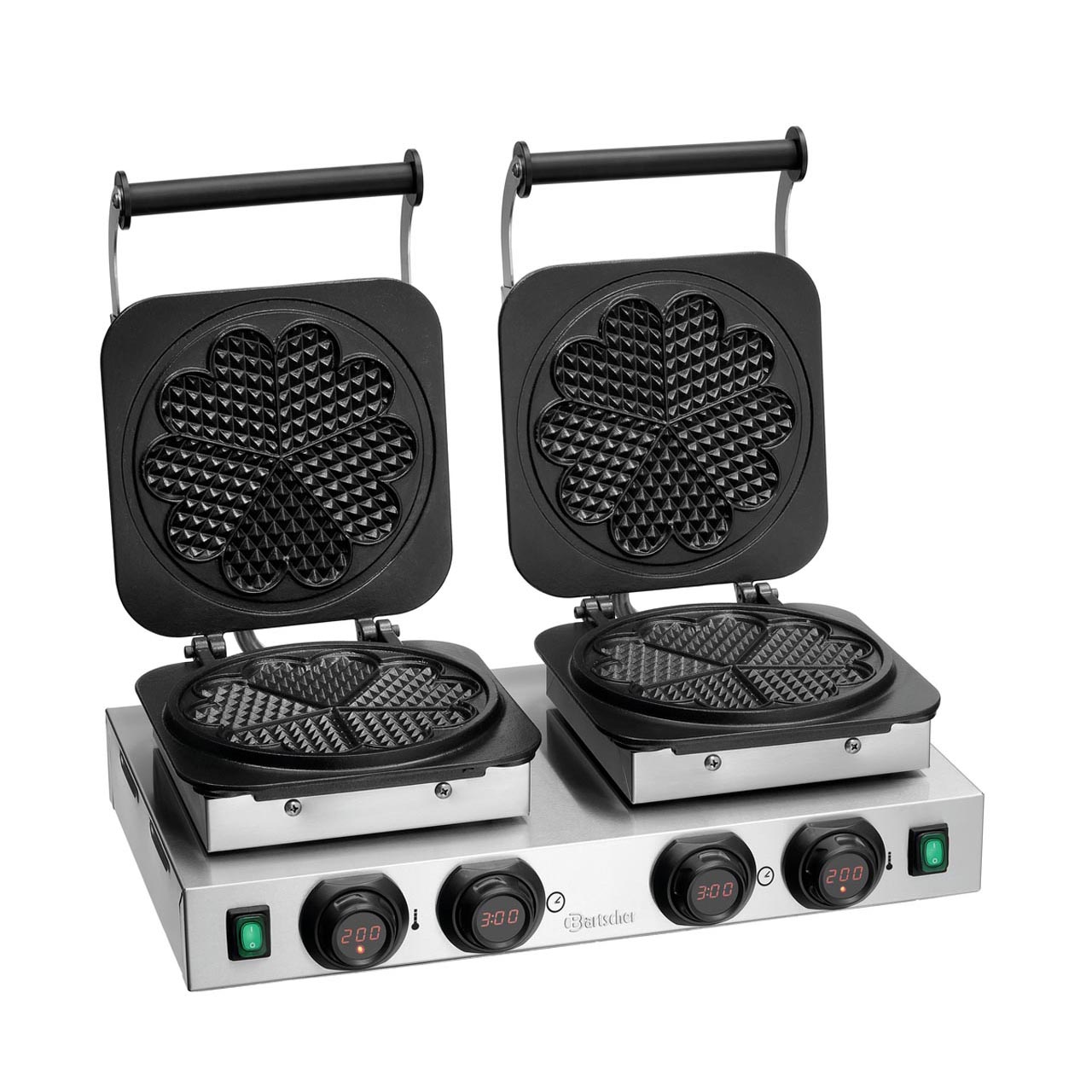Vaflovač s 2 x litinovými plechy, tvar srdce, průměr 210 mm. Vyžadovány 2 samostatné zásuvky. Robustní konstrukce, vysoký výkon. Materiál nerezová ocel. Rozměr vafle: průměr 210 mm, výška 16 mm, teplotní rozmezí od 50 do 300 °C, elektronická regulace teploty po 1 °C, manuální ovládání, digitální displej, časovač. Kontrolka zahřívání, signalizace uplynutí času (0 - 9:30 minut). Příkon: 4,4 kW / 2 x 230 V / 50/60 Hz. Rozměr: Š 600 x H 450 x V 225 mm. Hmotnost: 33,8 kg.