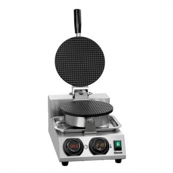 Vaflovač pro tvar zmrzlinových kornoutů, zmrzlinové misky nebo rolády. 1 pečicí deska pevně přimontovaná, materiál potažený hliník. průměr vafle 212 mm. Teplotní rozpětí od 50 do 300 °C, elektronická regulace po 1 °C, regulace MDI. Digitální ukazatel, časovač, kontrolka ohřátí, ZAP/VYP. Signalizace po uplynutí doby (0 - 9:30 Minut), funkce Memory. Dodáváno včetně dřevěné formy na tvarování vafle. Příkon 1 kW / 220 V. Materiál ušlechtilá ocel. Rozměr Š 255 x H 500 x V 540 mm. Hmotnost 1 kg.