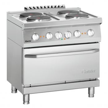 Elektrický sporák s elektrickou troubou. Sporák elektrický má 4 varné kulaté plotýnky průměru 220 mm. Přizpůsobený pro GN 2/1. Materiál: CNS 18/10. Provozní režim: elektrický 4 elektrické kulaté plotýnky Příkon: 15,8 kW / 400 V / 50 Hz / připojení 3 NAC. Rozdělení varných zón 4 x 2,6 kW. Rozměr 4 x průměr 220 mm. trouba – elektrická, multifunkční – oběhový vzduch – ušlechtilá ocel objem: 58 litrů rozměr: Š 535 x H 675 x V 265 mm / GN 2/1 příkon/napětí: 5,4 kW teplotní rozmezí od 100 do 300 °C / 3 vsuvy vzdálenost 90 mm / odsávání par Nastavitelné nohy od 850 do 900 mm. Rozměr: Š 800 x H 700 x V 850 mm. Hmotnost: 106 kg.