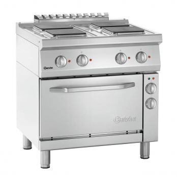 Elektrický sporák s elektrickou troubou. Sporák elektrický má 4 varné hranaté plotýnky 220 x 220 mm. Přizpůsobený pro GN 1/1. Materiál: CNS 18/10. Robustní konstrukce, jednoduchá údržba. Provozní režim: elektrický 4 elektrické hranaté plotýnky Příkon: 14,05 kW / 400 V / 50 Hz / připojení 3 NAC. Rozdělení varných zón 4 x 2,6 kW. Rozměr 4 x 220 x 220 mm trouba – elektrická, multifunkční - oběhový vzduch – ušlechtilá ocel objem: 58 litrů rozměr: Š 535 x H 370 x V 290 mm / GN 1/1 příkon/napětí: 3,65 kW teplotní rozmezí od 100 do 300 °C / 3 vsuvy vzdálenost 90 mm / odsávání par Nastavitelné nohy od 850 do 900 mm. Rozměr: Š 800 x H 700 x V 850 mm. Hmotnost: 100,6 kg.