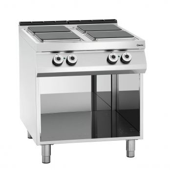 Elektrická sporák 4 plotýnkový s otevřeným podstavcem. Varná plocha elektrická. Sporák volně stojící v kvalitním nerezovém provedení. Stabilní nožky s nastavitelnou výškou. Materiál CNS 18/10. Provozní režim: elektrický. Varná plocha: elektrická. Spodní konstrukce: otevřená. 4 varné plochy elektrické. Rozměr: 300 x 300 mm. Rozložení 4 x 4 kW. Nastavitelné nohy od 900 do 950 mm. Teplotní rozpětí od 70 do 300 °C. Příkon: 16 kW / 400 V / 50/60 Hz, 3 NAC. Rozměr: Š 800 x H 900 x V 900 mm. Hmotnost: 84,2 kg.