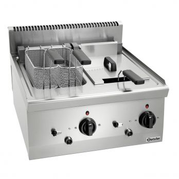 Stolní elektrická fritéza řady 600. Fritéza objemu 2 x 8 l s výpustným kohoutem. Fritéza Š 600 x H 600 mm s příkonem 12,6 kW. Výklopné topné těleso. Materiál CNS 18/10. Parametry: Provozní režim: elektrický 2x vana, objem 8 litrů 2x fritovací koš: Š 225 x H 275 x V 100 mm / Š 110 x H 280 x V 100 mm Topné těleso lze vyklopit. Výpustný ventil tuku. Ovládání knoflíkem, kontrolka. včetně 2 košů. Vypínač zapnuto/vypnuto: ne Příkon: 12,6 kW / 400 V / 50 Hz, 3 NAC Rozměr: Š 600 x H 600 x V 290 mm. Hmotnost: 34 kg