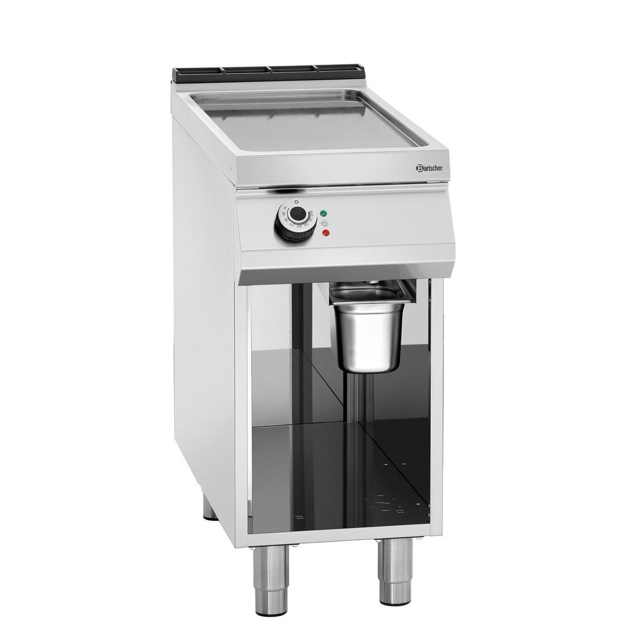 Volně stojící elektrická grilovací deska s otevřenou spodní konstrukcí. Elektrická grilovací deska s 1 topnou zónou v hladkém provedení z oceli se stabilními nožky s nastavitelnou výškou. Materiál CNS 18/10. Provozní režim: elektrický 1 topná zóna, ocel – hladká deska, rozměr: Š 355 x H 760 mm. Spodní konstrukce: otevřená. Nastavitelné nohy od 900 do 950 mm. Příkon: 7,5 kW / 400 V / 50/60 Hz, 3 NAC. Rozměr: Š 400 x H 900 x V 900 mm. Hmotnost: 66,4 kg.