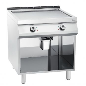 Volně stojící elektrická grilovací deska s otevřenou spodní konstrukcí. Elektrická grilovací deska se 2 topnými zónami v hladkém provedení z oceli se stabilními nožky s nastavitelnou výškou. Materiál CNS 18/10. Provozní režim: elektrický 2x topná zóna, ocel – hladká deska, rozměr: Š 723 x H 760 mm. Zóny lze ovládat samostatně. Spodní konstrukce: otevřená. Nastavitelné nohy od 900 do 950 mm. Příkon: 15 kW / 400 V / 50/60 Hz, 3 NAC. Rozměr: Š 800 x H 900 x V 900 mm. Hmotnost: 123 kg.