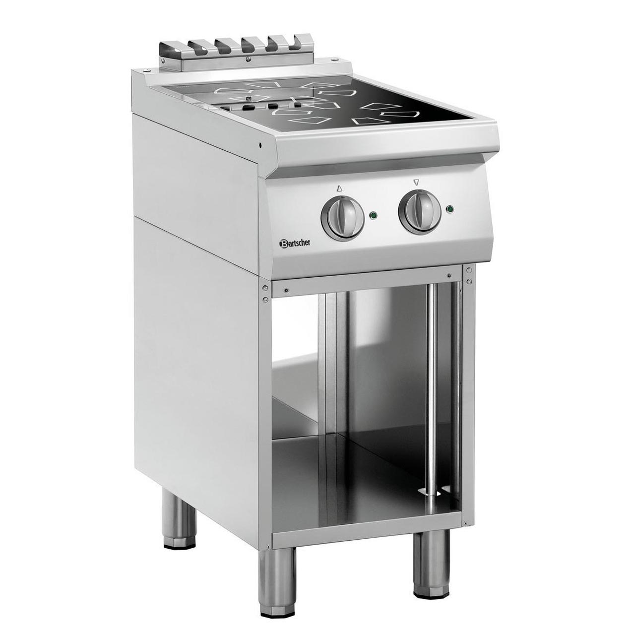 Volně stojící indukční sporák s otevřenou spodní konstrukcí. 2 varné indukční zóny. Varná deska SCHOTT CERAN. Materiál: CNS 18/10. Provozní režim: indukce 2 indukční zóny 9 úrovní výkonu. Rozpoznání nádobí. Ochrana IPX4. Tukový filtr pod varnými zónami. Příkon: 10 kW / 400 V / 50/60 Hz / připojení 3 NAC. Rozdělení varných zón 2 x 5 kW. Průměr 220 mm. Spodní konstrukce: Š 370 x H 490 x V 405 mm. Nastavitelné nohy od 850 do 900 mm. Rozměr: Š 400 x H 700 x V 850 mm. Hmotnost: 35,6 kg.