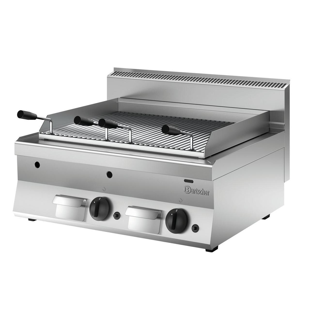 Stolní lávový gril řady 650 Bartscher z chromniklové oceli 18/10. Rozměr Š 800 x H 650 x V 295 s hmotností 69,2 kg. Na propan-butan, trysky na zemní plyn jsou přiloženy. Rozměr grilovací plochy 660 x 580 mm. Dvě topné zóny, 1 grilovací plocha. Součástí lávové kameny pro první použití.