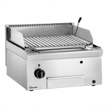 Stolní plynový lávový gril s 1 topnou zónou. Grilovací deska V-rošt (na maso). Materiál CNS 18/10. 1 tepelná zóna. 1 grilovací plocha. V-rošt (na maso). Včetně lávových kamenů pro počáteční plnění. V-rošt (na maso). Výškově nastavitelný. Na zkapalněný plyn. Součástí sady jsou trysky pro zemní plyn. Piezo-zapalování. Ochrana proti stříkání. Příkon: 7,3 kW. Rozměr: Š 600 x H 600 x V 290 mm. Hmotnost: 49 kg.