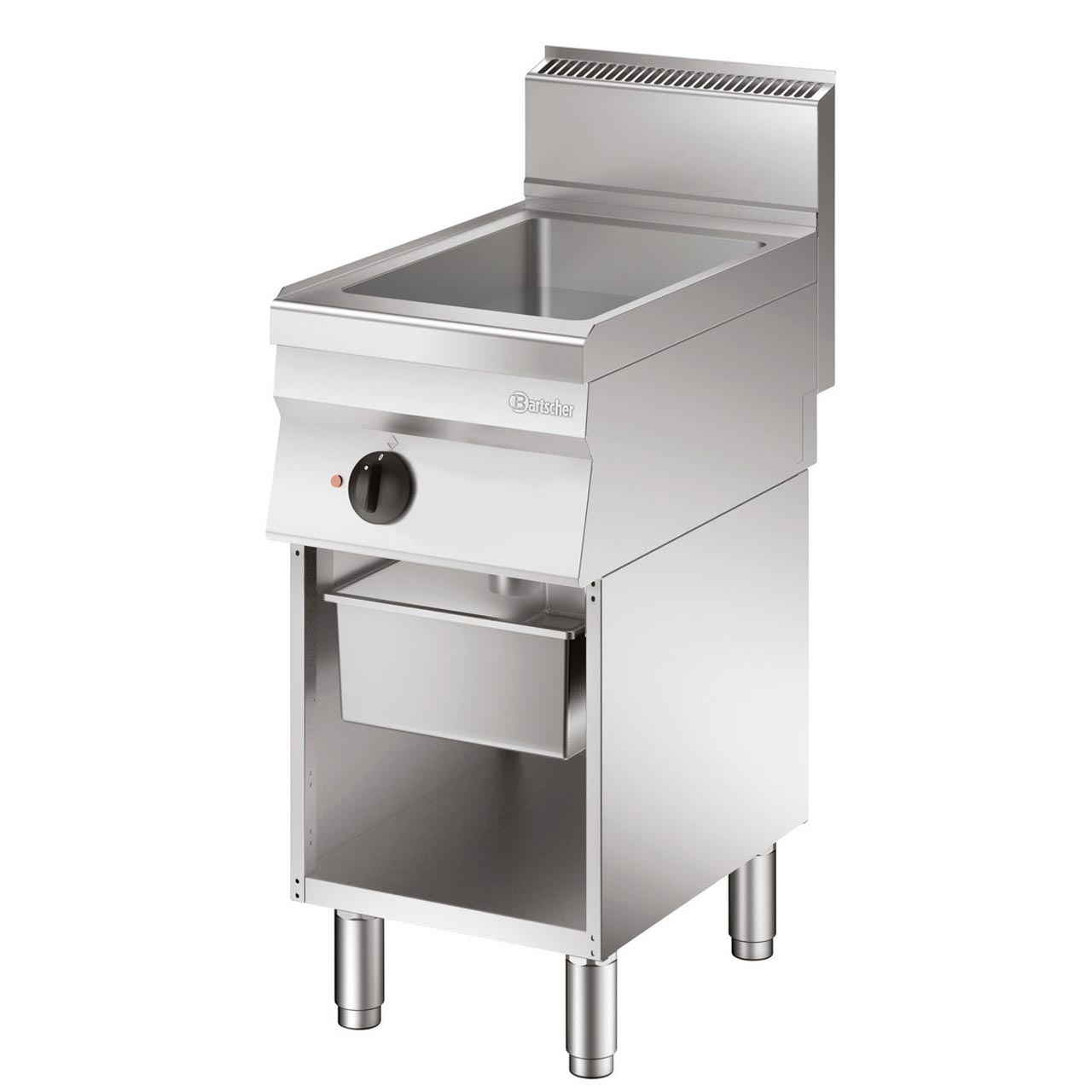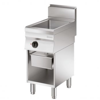 Univerzální gril s otevřeným podstavcem na nožičkách. Objem nádoby 13 litrů, materiál CNS 18/10, rozměr Š 320 x H 480 x V 92,5 mm. 1 topná zóna. Síla pečicí desky 9,5 mm. Jedna zachycující miska GN 1/1 - hloubky 150 mm. Zaoblené rohy. Celkový rozměr Š 400 x H 650 x V 870 mm, hmotnost 41 kg. Materiál CNS 18/10.