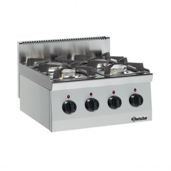 Stolní plynový sporák v kvalitním nerezovém provedení. Sporák plynový se 4 hořáky. Materiál CNS 18/10. Provozní režim: plyn. Varná plocha: plyn. 4 hořáky, rozložení: 2 x 3,5 kW (přední), 2 x 6 kW (zadní) Na kapalný plyn (50 mbar). Trysky na zemní plyn H (20 mbar) a L (20 mbar) přiloženy. Pilotní plamen. Příkon: 19 kW. Rozměr: Š 600 x H 600 x V 290 mm. Hmotnost: 30,3 kg.