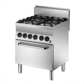 Plynový sporák série 650 je vyrobený z nerezové chrom-niklové oceli 18/10. Napájení 4 hořáků je plynové s celkovým příkonem 18 kW, elektrická trouba velikosti GN 1/1 s příkonem 4,2 kW.