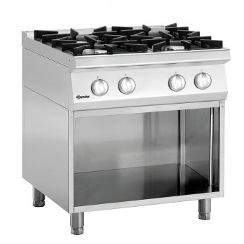 Sporák je vybaven 4 plynovými hořáky. Litinové rošty s odnímatelnou sběrnou vanou. Varná deska 330 270 mm. Materiál: CNS 18/10. 4 plynové hořáky, manuální zapalování, dvouokruhový plynový hořák, pilotní plamen rozměr varných desek: 330 x 270 mm příkon: 29,4 kW (rozdělení plotýnek: 2 x 6,2 kW, 2 x 8,5 kW) Spodní konstrukce: otevřená, Š 399 x H 610 x V 470 mm. Nastavitelné nohy od 850 do 900 mm Rozměr: Š 800 x H 700 x V 850 mm. Hmotnost: 58 kg Zemní plyn H (20 mbar), trysky na kapalný plyn (50 mbar) a trysky na zemní plyn L (20 mbar) součástí dodávky.