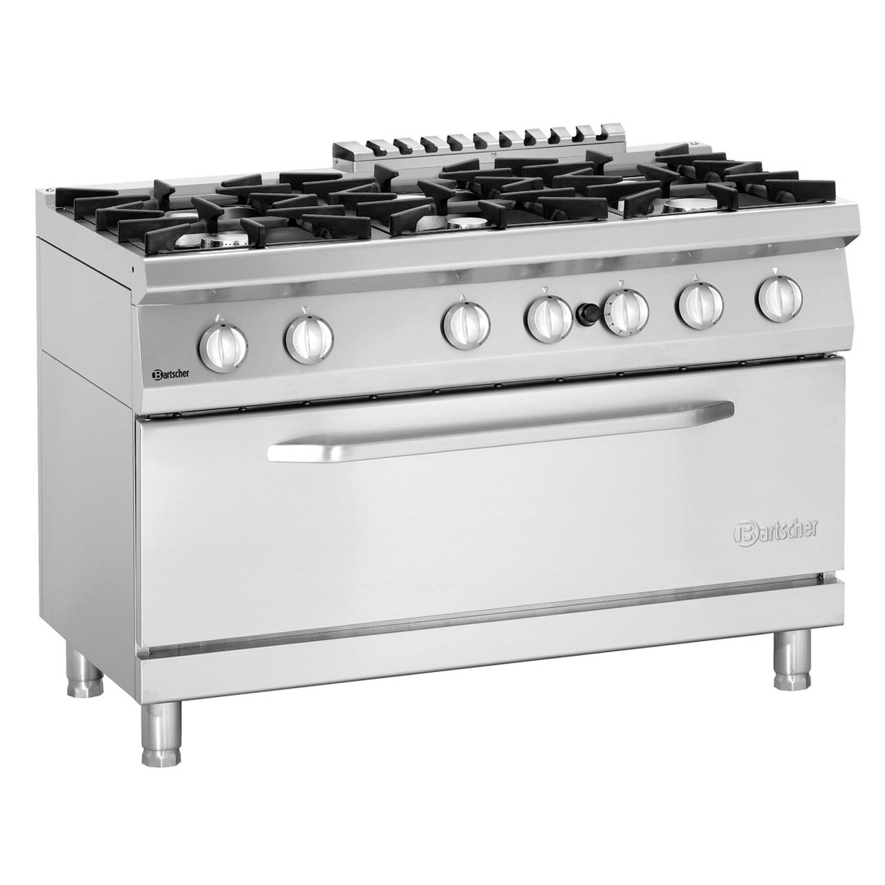 Plynový sporák s plynovou troubou se 6 hořáky. Litinové rošty s odnímatelnou sběrnou vanou. Varná deska 330 x 270 mm. Materiál: CNS 18/10. Provozní režim: plyn 6 plynových hořáků manuální zapalování, dvouokruhový plynový hořák, pilotní plamen rozměr varných desek: 330 x 270 mm příkon: 57,6 kW (rozdělení plotýnek: 3 x 6,2 kW, 3 x 8,5 kW) trouba – plynová - piezo zapalování - spodní ohřev - CNS 18/0 objem: 193 litrů rozměr: Š 1050 x H 530 x V 300 mm příkon/napětí: 13,5 kW teplotní rozmezí od 140 do 300 °C / 3 vsuvy vzdálenost 90 mm / odsávání par Nastavitelné nohy od 850 do 900 mm. Rozměr: Š 1200 x H 700 x V 850 mm. Hmotnost: 176 kg Zemní plyn H (20 mbar), trysky na kapalný plyn (50 mbar) a trysky na zemní plyn L (20 mbar) součástí dodávky.