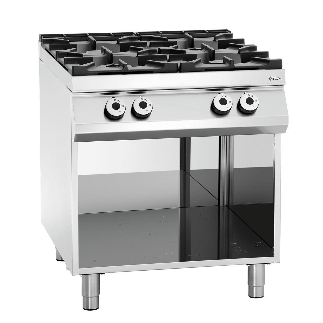 Sporák plynový se 4 hořáky s otevřenou spodní konstrukcí. Plynový sporák volně stojící v kvalitním nerezovém provedení. Stabilními nožky s nastavitelnou výškou. Materiál CNS 18/10. Provozní režim: plyn. Varná plocha: plyn. Spodní konstrukce: otevřená. 4 hořáky, rozložení: 1 x 3,5 kW, 1 x 5 kW, 2 x 8 kW Nastavitelné nohy od 900 do 950 mm. Na zemní plyn. Součástí jsou trysky na kapalný plyn (50 mbar) a trysky na zemní plyn L (20 mbar). Dvouokruhový hořák, ruční zapalování. Odnímatelná odkapávací miska pod hořáky. Příkon: 24,5 kW. Rozměr: Š 800 x H 900 x V 900 mm. Hmotnost: 95 kg.