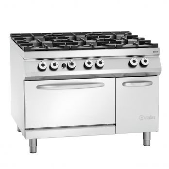 Sporák plynový se 6 hořáky s plynovou troubou a skříňkou. Plynový sporák volně stojící v kvalitním nerezovém provedení. Stabilními nožky s nastavitelnou výškou. Materiál CNS 18/10. Provozní režim: plyn. Varná plocha: plyn. 6 hořáků, rozložení: 1 x 3,5 kW, 2 x 5 kW, 3 x 8 kW Plynová trouba GN 2/1, rozměr: Š 655 x H 550 x V 300 mm. Připojení 8 kW. Spodní skříňka: Š 345 x H 835 x V 470 mm. Křídlové dveře. Vlastnosti trouby: Piezo-zapalování. Nastavitelné nohy od 900 do 950 mm. Teplotní rozpětí od 60 do 300 °C. Na zemní plyn. Součástí jsou trysky na kapalný plyn (50 mbar) a trysky na zemní plyn L (20 mbar). Dvouokruhový hořák, ruční zapalování. Odnímatelná odkapávací miska pod hořáky. Příkon: 45,5 kW, 400 W, 50/60 HZ, 3 NAC. Rozměr: Š 1200 x H 900 x V 900 mm. Hmotnost: 195,9 kg.
